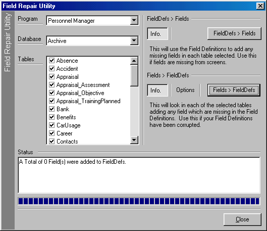 To correct this you will need to follow the steps listed below.Once this has run you should see a message saying e.g. "A Total of 0 Field(s) were added to FieldsDefs"
